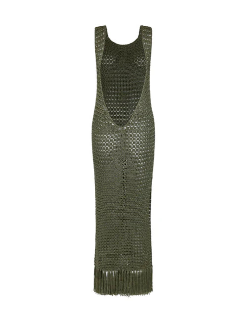 S-Mode High Neck Dress with Fringe in Olive